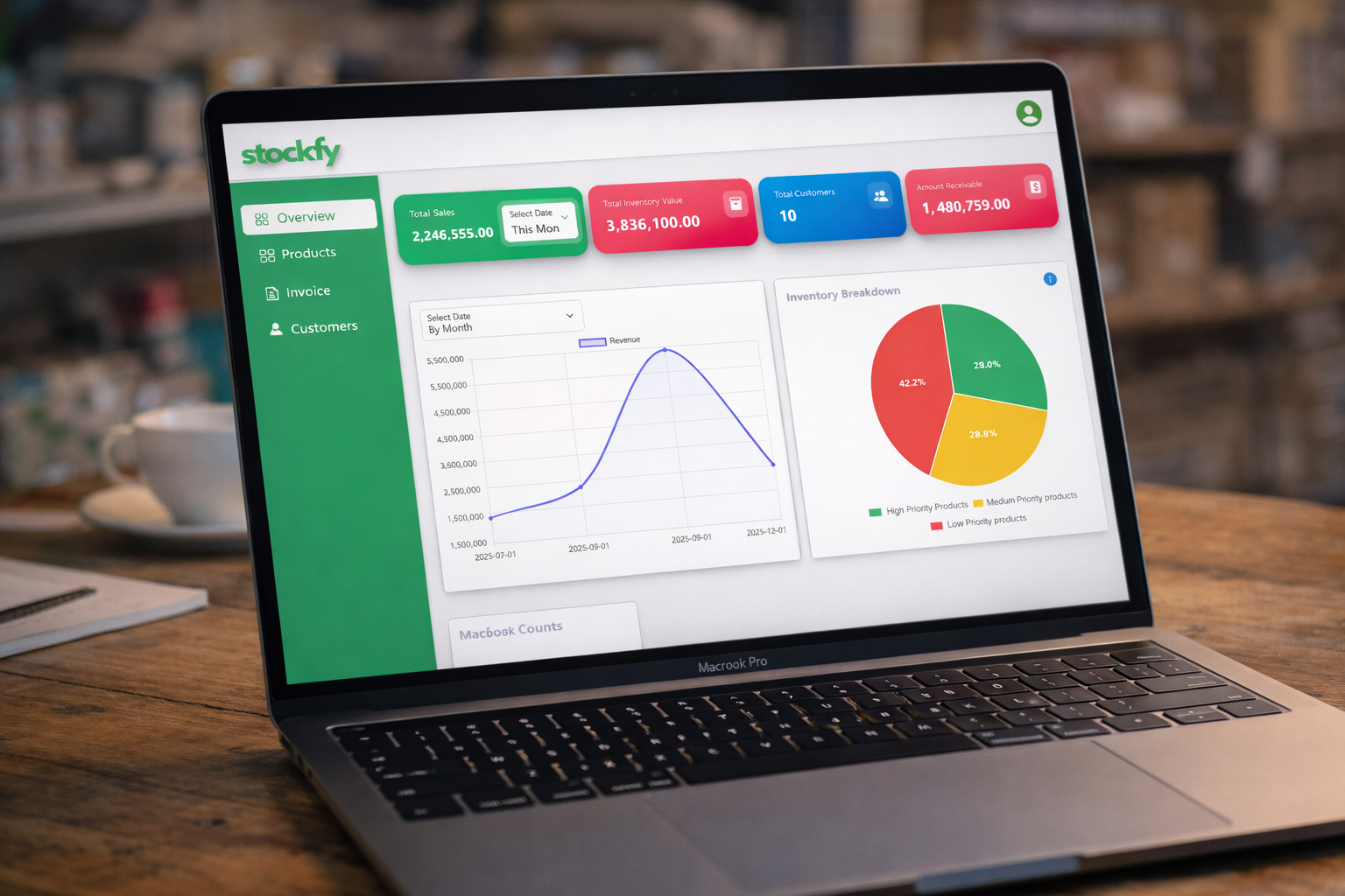 Stockfy helps you manage stock, invoices, and reports - all in one simple dashboard. No more Excel struggles. Save time and focus on growing your business